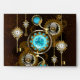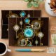 Turquoise lenses with an antique watch with brass gears and golden keys on rusty, brown background. Steampunk style.