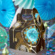 Turquoise lenses with an antique watch with brass gears and golden keys on rusty, brown background. Steampunk style.