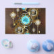 Turquoise lenses with an antique watch with brass gears and golden keys on rusty, brown background. Steampunk style.