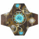 Turquoise lenses with an antique watch with brass gears and golden keys on rusty, brown background. Steampunk style.