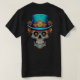 He's a cool cat, in his blue top-hat and shining, white teeth. Steampunk skull design images on a black, short sleeve t-shirt for men and women.