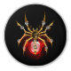 Mechanical, steampunk spider with gold, brass gears and a red glass lamp on a black background. Steampunk style.