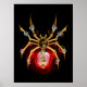 Mechanical, steampunk spider with gold, brass gears and a red glass lamp on a black background. Steampunk style.