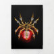 Mechanical, steampunk spider with gold, brass gears and a red glass lamp on a black background. Steampunk style.