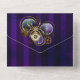 Steampunk spider made of gold and steel with antique watches decorated with gold gears on purple, striped, textured background with lenses and brass gears. Steampunk style.