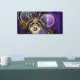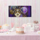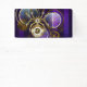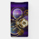 Steampunk spider made of gold and steel with antique watches decorated with gold gears on purple, striped, textured background with lenses and brass gears. Steampunk style.