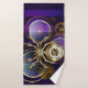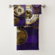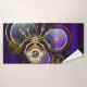 Steampunk spider made of gold and steel with antique watches decorated with gold gears on purple, striped, textured background with lenses and brass gears. Steampunk style.