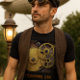 Personalise this steampunk shirt with your own text. This shirt with the industrial clock gears and faux black leather trim was designed for him and would make a great birthday or just because gift.