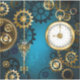 Turquoise, textured, steampunk background with brass and gold gears, a silver key and the clock. Steampunk style.