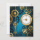 Turquoise, textured, steampunk background with brass and gold gears, a silver key and the clock. Steampunk style.