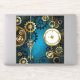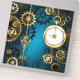 Turquoise, textured, steampunk background with brass and gold gears, a silver key and the clock. Steampunk style.
