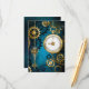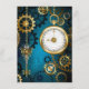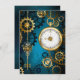 Turquoise, textured, steampunk background with brass and gold gears, a silver key and the clock. Steampunk style.
