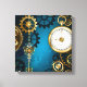 Turquoise, textured, steampunk background with brass and gold gears, a silver key and the clock. Steampunk style.
