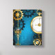 Turquoise, textured, steampunk background with brass and gold gears, a silver key and the clock. Steampunk style.