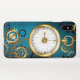 Turquoise, textured, steampunk background with brass and gold gears, a silver key and the clock. Steampunk style.