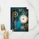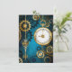 Turquoise, textured, steampunk background with brass and gold gears, a silver key and the clock. Steampunk style.