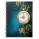 Turquoise, textured, steampunk background with brass and gold gears, a silver key and the clock. Steampunk style.
