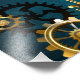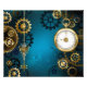 Turquoise, textured, steampunk background with brass and gold gears, a silver key and the clock. Steampunk style.