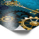 Turquoise, textured, steampunk background with brass and gold gears, a silver key and the clock. Steampunk style.