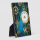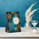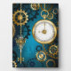 Turquoise, textured, steampunk background with brass and gold gears, a silver key and the clock. Steampunk style.