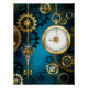 Turquoise, textured, steampunk background with brass and gold gears, a silver key and the clock. Steampunk style.