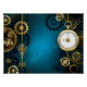 Turquoise, textured, steampunk background with brass and gold gears, a silver key and the clock. Steampunk style.