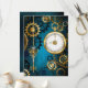 Turquoise, textured, steampunk background with brass and gold gears, a silver key and the clock. Steampunk style.