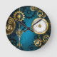 Turquoise, textured, steampunk background with brass and gold gears, a silver key and the clock. Steampunk style.