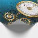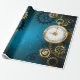 Turquoise, textured, steampunk background with brass and gold gears, a silver key and the clock. Steampunk style.