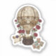 A detailed steampunk-inspired hot air balloon illustration featuring vintage maps, gears, roses, and travel elements.