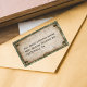 A vintage wedding address label, with a distinct Victorian, steampunk look, consisting of a border of green floral wallpaper, gold metal buttons at each corner and vintage brown paper.