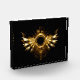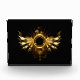 Shiny mechanical wings, with gears and brass round banner. Steampunk