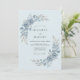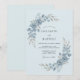 This design features a serene botanical arrangement in shades of ice and steel blue. Delicate watercolor roses and silvery eucalyptus leaves create an ethereal, frosty mood. The pale blue background enhances the soft, painterly aesthetic of the floral sprays.