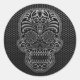 This symmetrical sugar skull design is decorated with intricate light green swirls and dot patterns. The eyes of the skull are made of two circular flowers and there is a five point star in the middle of the forehead. A shadow falls onto the steel mesh background giving the pattern an industrial look. This stylish sugar skull is a unique interpretation of this Day of the Dead symbol.