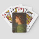 This design features a painting by the English Victorian artist Frank Dicksee (1853–1928). It is a portrait of a beautiful woman with red hair. She has a wreath of white roses around her head. She has blue eyes and rosy red lips. She is wearing a green dress. There are dark clouds in the evening sky behind the lady. The original artwork was painted by Frank Dicksee in 1900.