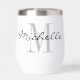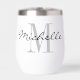Stemless wine tumbler glass with custom monogram. Elegant script typography with monogrammed initial letter. Classy design for home, fancy wedding party, bridal shower, engagement, anniversary, birthday etc. Add your own name or family surname. White or personalised background colour. Colours can be changed. Exclusive drinking gifts and party favours. Double sided print.