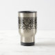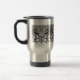 Black and white mug with an elaborate Victorian stencil design. There are ribbons, leaves, swirls, curves, and dots. With all the different elements working together in this design I think it ultimately has a delicate, lacy quality.