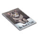 Notebook in an illustration of a stern-looking grey tabby cat with piercing yellow eyes resting its front paws on a ledge, gazing directly forward with an air of serious authority. Below the cat, bold script reads, “We Need to Talk,” adding humour and drama.