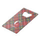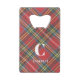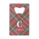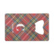 A trendy Royal Stewart Tartan plaid print covers the front and back of this bottle opener with white initial and name. Change or remove text to make it yours using the Template provided. Dimensions: 2"w x 3.25"l x .125"h. Fits into a wallet credit card slot. All over printing with protective coating. Stainless steel construction for extra durability. See "About This Product" at side for additional information.