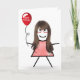 Stick girl with red balloon, gingham dress, hair, and red glasses on white background for birthday