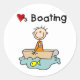 A boy stick figure wearing a life jacket sits in a boat as a fish goes by and text reads "(heart) boating" on our Stick Boy Loves Boating T-shirts, mousepads, stickers, magnets, and other items.