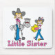Stick Cowgirls wearing jeans and pink boots with stick horse and hay, and text 'Little Sister '. Has matching big sister design.