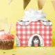 Cute stick figure girl with long dark hair and daisies on red and white gingham background.