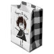 Cute stick girl with hair, glasses, polka dot dress, sneakers, and daisy bouquet on white with black and white buffalo plaid pattern.