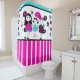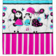 Girls who love bright colours and cute stick figures will adore this shower curtain featuring three stick figure girls, one with a pink umbrella, heart trees, and butterflies as well as a top border of bright turquoise blue and bottom of pink and white stripes.