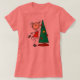 A stick figure girl dressed in traditional red and green Christmas colours dances around the holiday tree on cute holiday T-shirts, mugs, tote bags, cards, and other customisable stick figure holiday tree design items!