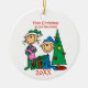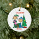 Stick figure male and female, a holiday tree, and red text that reads First Christmas In Our New Home with a customisable date.