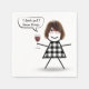 Stick girl wearing buffalo plaid dress with hair, glasses, and holding a glass of red wine for cocktail party.