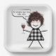 Stick girl wearing buffalo plaid dress with hair, glasses, and holding a glass of red wine for party.