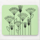 This mouse pad has a mid-century modern design of plants made from lines, circles, triangles, rectangles, and squares in black on a green background.